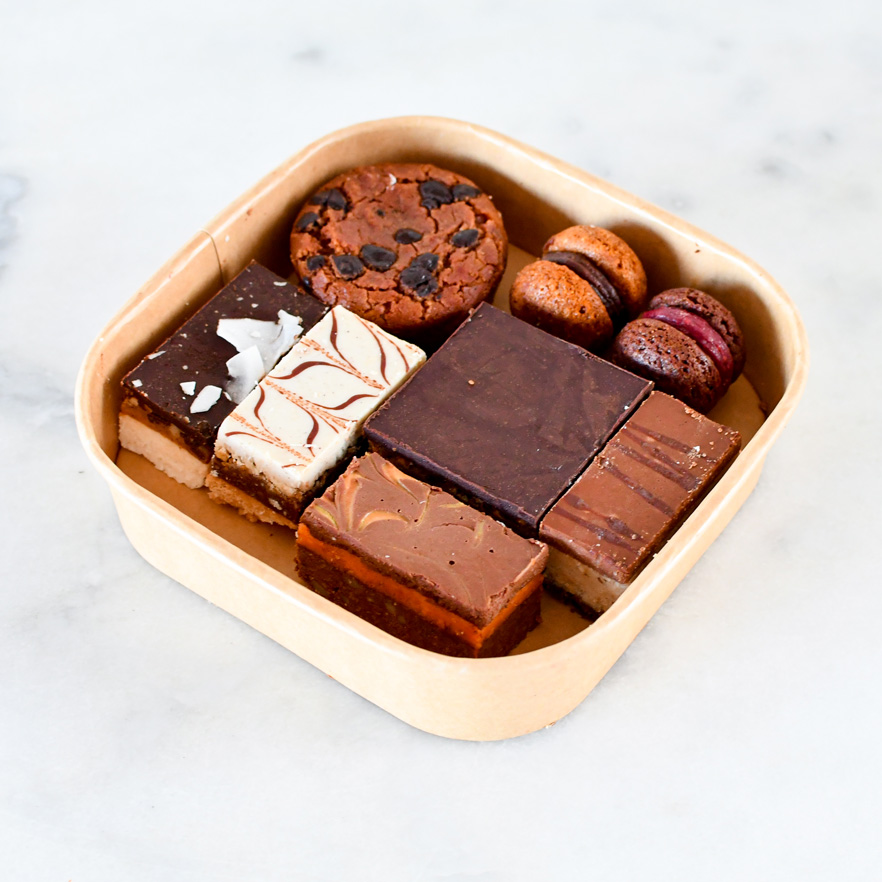 Onze choco boxie voor alle chocolate lovers out there; met onze caramel shortbread, stellar shortbread en heel veel meer choco taartjes, choco cakie rounds & karma caramels​​.