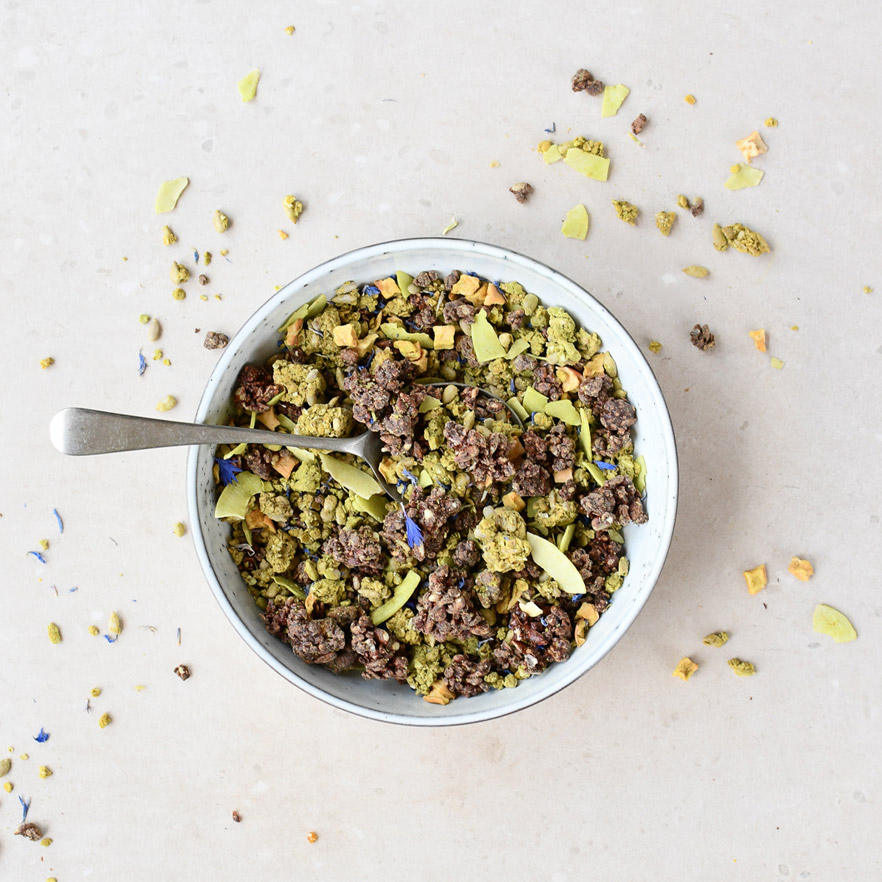 Geniet van onze flower granola voor het vrolijkste begin van je dag. Langzaam & licht geroosterd met een druppel ahornsiroop voor het zoetje en olijfolie voor de crunch. Glutenvrije havermout met aardse matcha uit Japan, bloemen, fruit en chocolade
