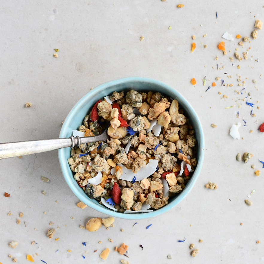 Geniet van onze flower granola voor het vrolijkste begin van je dag. Langzaam & licht geroosterd met een druppel ahornsiroop voor het zoetje en olijfolie voor de crunch. Boekweitvlokken, cashews van een boeren coöperatie uit Benin/Togo, lavendel, fruit en bloemen.
