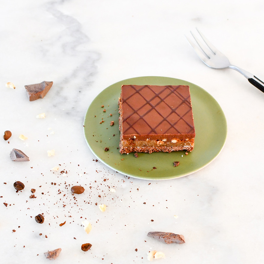 Onze caramel shortbread met chocolade bodem, koffie caramel en sticky koffie choco toplaag. In ieder laagje zit koffie verwerkt van de beste koffiebranderij uit Rotterdam: Manhattan coffee.