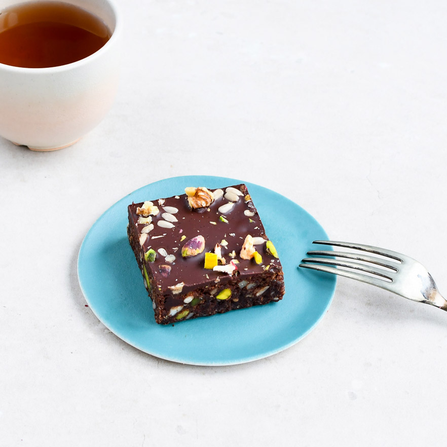 Een brownie, zoals een brownie bedoelt is, maar met een beetje extra Sharp Sharp, met heel veel nootjes, zoals walnoten, pistache & cashews en met heerlijke warme kruiden zoals anijs, cayenne en kaneel. Afgemaakt met een dun crunchy laagje choco is de brownie compleet.